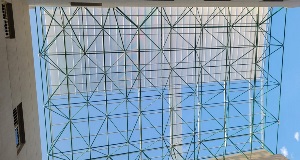 The Toploc system is attached to a spaceframe, secured to the concrete structure of the building and situated above two interior courtyard areas of the school.