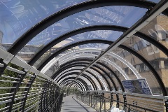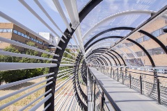 A total of 90 sheets of almost 5m long, 8mm clear Marlon FSX flat polycarbonate sheets were supplied and cold curved on-site to glaze the roof of new walkway.