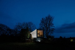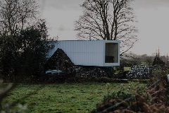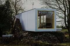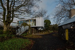 Barney’s Ruins, an 1830s Irish cottage, was home to architect Patrick Bradley’s great-great-uncle, Bernard (“Barney”). After over a century of abandonment, Patrick and his father restored the building to honour their ancestor. Patrick’s design features a sleek, modern cottage constructed from an old shipping container that appears to float above the ruins, blending contemporary style with history.