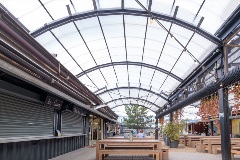 In this instance, clear 16mm sevenwall Marlon Toploc panels were cold curved on-site and mounted in sections at three different heights to a retractable pulley, allowing the canopy roof to open. The Marlon Toploc panels are secured with the Marlon polycarbonate cap profile for a seamed finish on the canopy roof.