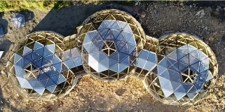A geodesic dome is a sphere or part of a sphere made from triangles. As a shape, a dome is much more efficient than a cube with the same size of footprint. It has 30% less surface area and therefore transmits about a third less heat into the atmosphere. It also uses fewer materials to build. Using triangles to build a dome gives further advantages as this shape transfers force more evenly through its sides. A geodesic dome also allows wind to move around it more easily than other shapes.